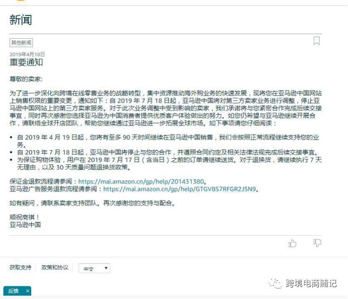4月18日下午,亚马逊官方给卖家发布重要通知——自2019年7月18日起,亚马逊中国将对第三方卖家业务进行调整,停止亚马逊中国网站上的第三方卖家服务。对于此次业务调整中受到影响的卖家,承诺完成后续交接事宜。
