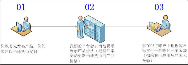 在我们的平台将会以当地的货币展示并销售您的产品,这样您就可以增加拥有无法使用国际信用卡的客户来购买你的产品。无须担心收到的金额币种,我们平台最终与您结算的金额币种是美元。