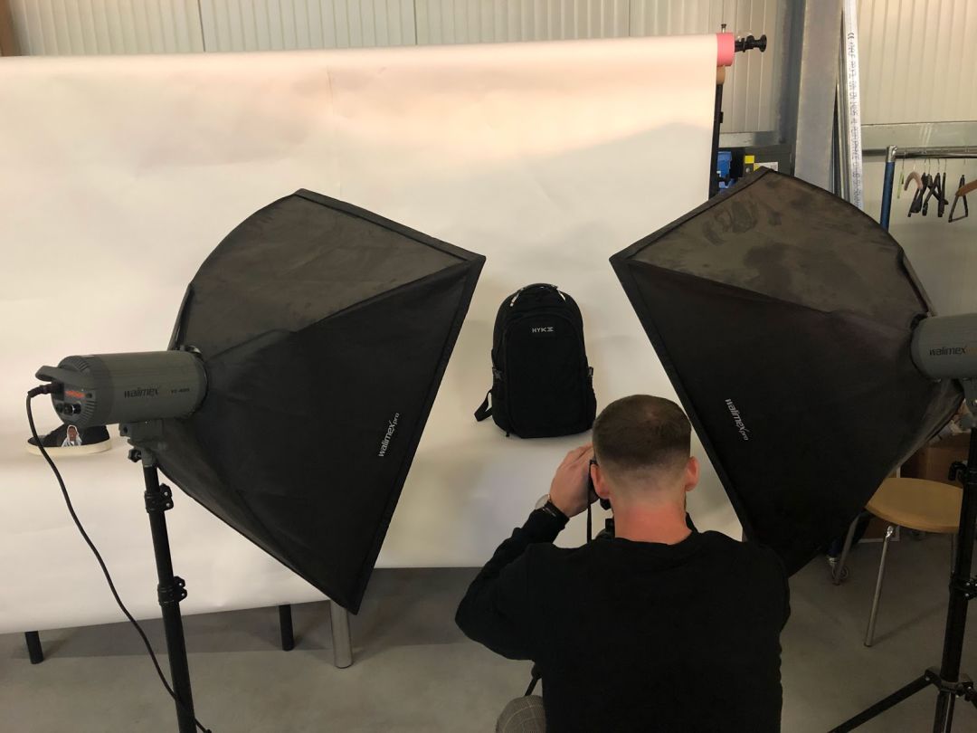Tim在谷歌上搜索“wilhelmshaven startup”时,发现了一家当地的运动鞋初创企业,Tim给他们打了电话,并安排第二天见面详谈。最后他通过和对方创始人交换市场资讯,获得了他们的相机设备和一个小型摄影棚,实现双赢。下图是对方创始人在为Tim拍摄产品图: