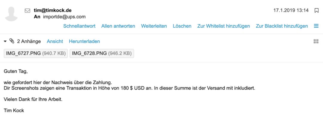 Tim给联合包裹服务公司UPS发送了一封电子邮件,上面有他在阿里巴巴上的交易截图,用来处理这次的海关问题:
