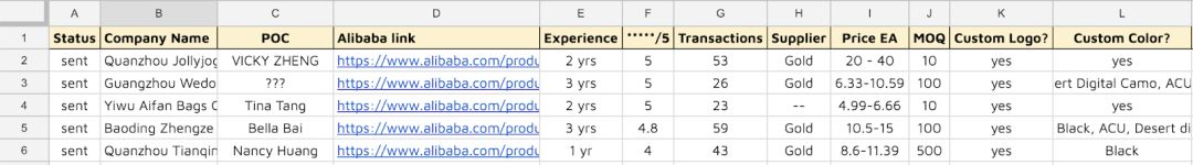 下一步就是要一一向供应商询盘。基本上是询问货物的最小起订量(MOQ)、单价以及运费。但就Tim而言,他还需要询问橡胶贴章的价格。