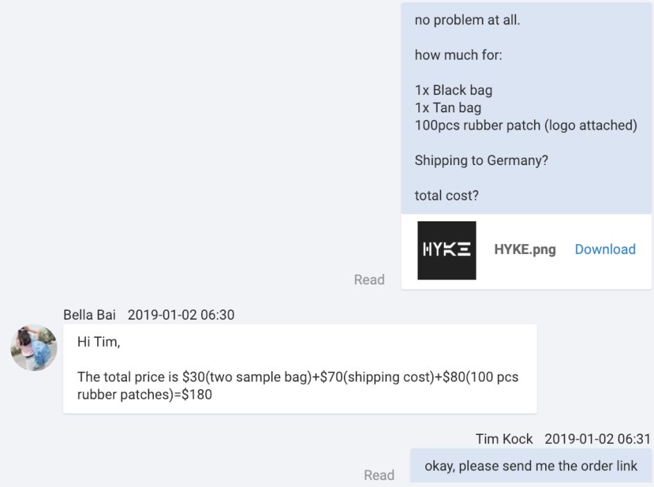 为了测试背包和橡胶贴章的质量,Tim选购了两个不同颜色的背包和两个橡胶贴章。由于制造商的整备成本很高,一包带两个橡胶贴章的样品需要花60美元,而100个橡胶贴章只需80美元。于是Tim决定再多花20美元订购100个橡胶贴章。这样包含快递到德国的运费,背包和橡胶贴章样品总共180美元,这个价格看起来相对靠谱,于是他下了样品订单。