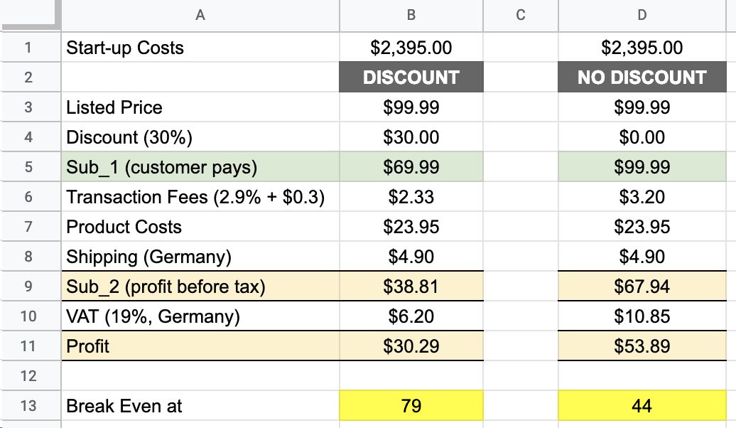 接下来,要计算Tim要卖多少个背包才能赚回本钱。把所有的数据放进谷歌电子表格,计算出两种结果。一种是给客户提供7折优惠(如下图B栏所示),另一种是不提供折扣优惠(如D栏所示)的情况下需要销售多少背包才能回本: