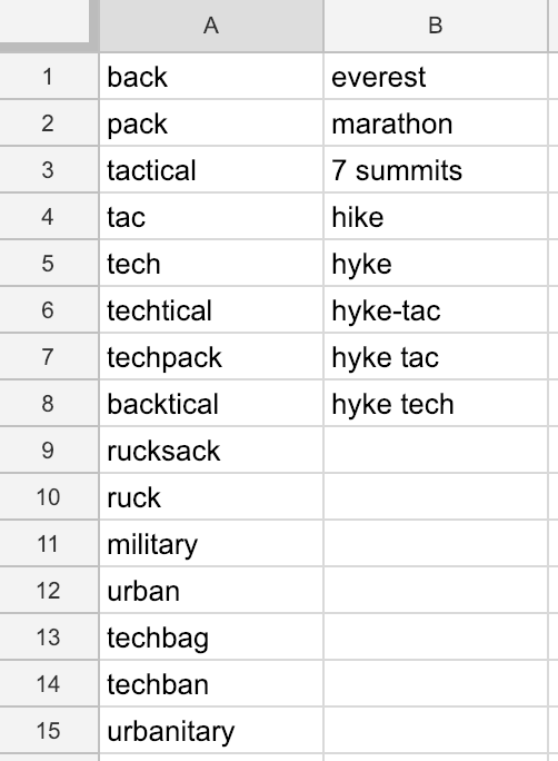 要知道在思考品牌名称和logo的过程中,想太多只会浪费时间。因此在想品牌名称的时候,Tim把能想到的相关关键词放入谷歌电子表格(Google spreadsheet)中,最终得出了以下结果: