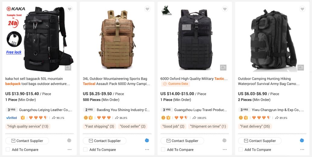 Tim过去曾和阿里巴巴的供应商有打过交道,知道要怎么找供应商。于是他在网页上输入了一些关键词,如backpack、tactical backpack、military backpack、functional backpack等关键词,并看到了相应的产品。