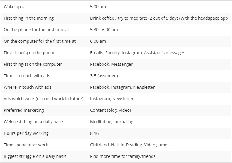 尽管受众特点已经很明显,但是他还是想继续深入挖掘。统计数据不仅包括个人信息统计,还包括消费者行为和Tim的日常生活。