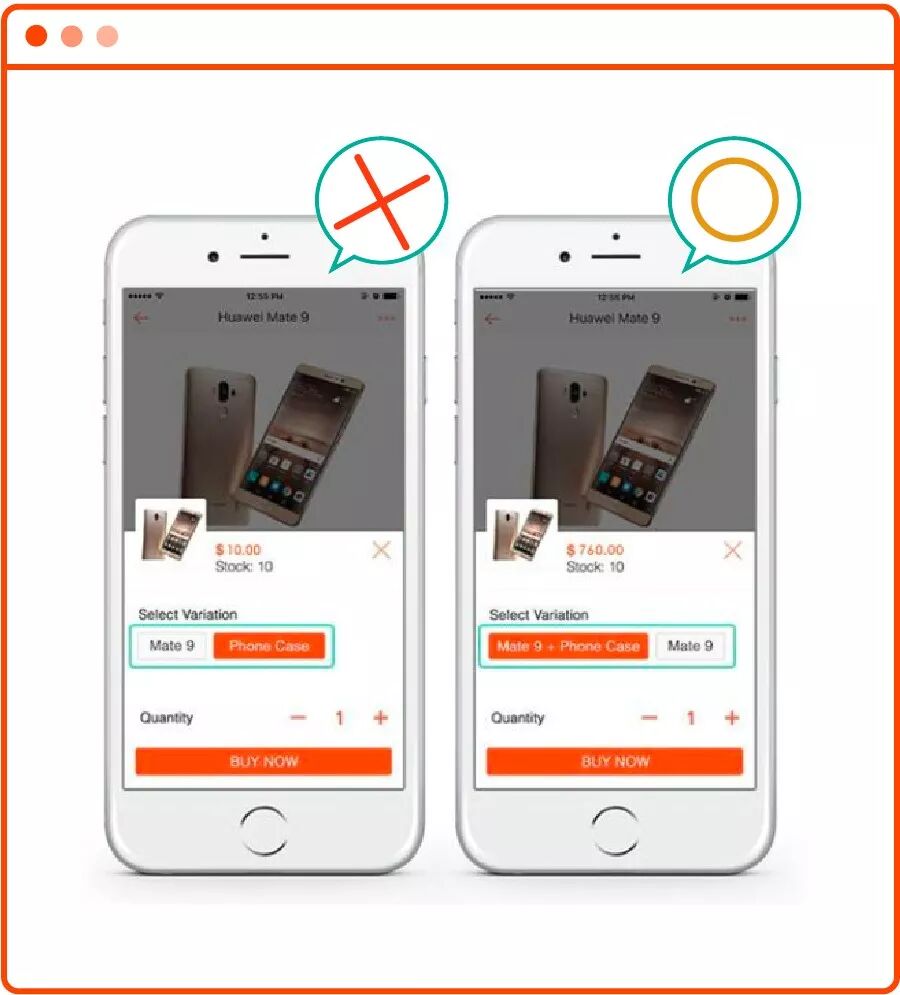 当销售手机套组的时候,一套产品包括手机(价值$750)和手机壳(价值$10)。如果将手机和手机壳分别列出,卖家看到界面以为手机价格是$10~$750,以为最低仅$10可购买一部手机,将产生误解和疑惑。正确做法是商品应设置为$750手机和$760手机+手机壳。