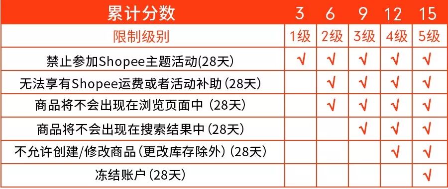 Shopee为了更好地规范平台,对不同累计分数设置了不同级别,不同级别对应的平台限制不同。卖家越多遵守平台规则,越少被计分,获得的平台权利越大,平台也因卖家们的规范运营,而变得更和谐。Shopee致力于为买家提供优质的购物平台,让买家买得放心,为卖家提供良好的销售平台,让卖家赚得开心。