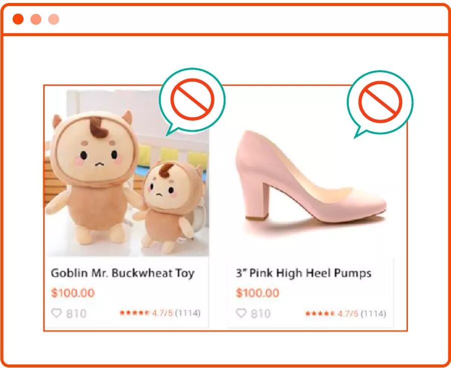 图片中原玩具的产品页面,更换为高跟鞋的产品信息,原有的评价将会对消费者产生误导。