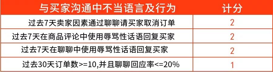 2.过去7天评论及聊聊中使用辱骂性话语的卖家将被计2分。若为优选卖家,同时将被移除优选卖家资格。