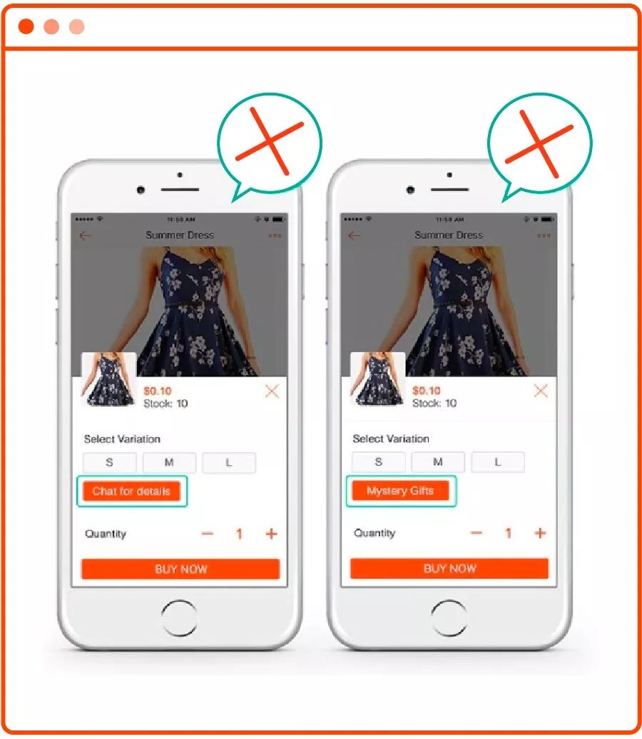 卖家将商品价格设置为远低于实际商品市场价格,例如在连衣裙选项中设置Chat for details(咨询了解更多)、Mystery Gifts(神秘礼物)等$0.10的选项吸引消费者,此为误导性定价,将会被系统删除。