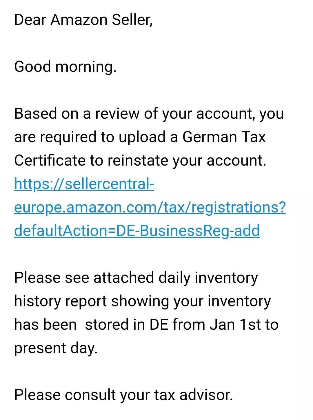 这位卖家收到了账户审核邮件,要求上传德国税务证明来恢复账号。但目前还未可知是否也是因为产品没有五国说明书的缘故遭审核。