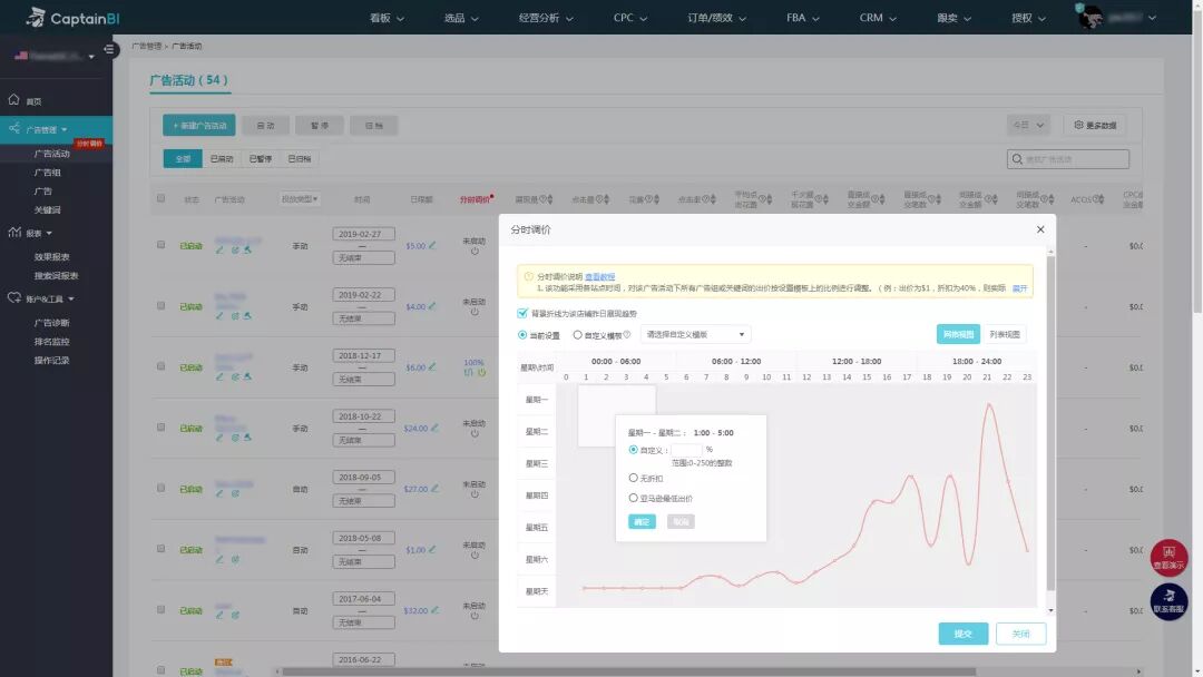 平日的广告预算,根据效果可以调整每天不同时段的出价,将大部分预算集中在广告转化率较高的时间段,将转化率极差的时间段的竞价设为亚马逊最低出价(广告不能随意暂停),由此避免浪费过多的广告预算。
