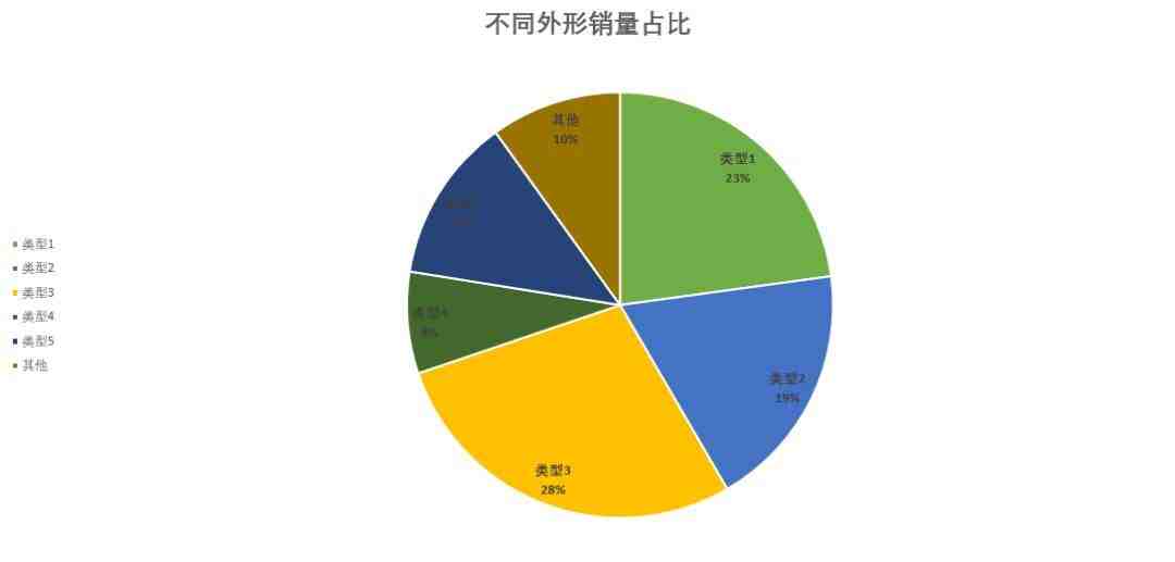 从外形分类看,各类型代表图片、特点如上图所示,各主要类型单品出现次数分别为20、17、28、8、17,销量占比分别为23%、19%、28%、8%、4%、12%;其中以类型三占比最高,其次为类型一。