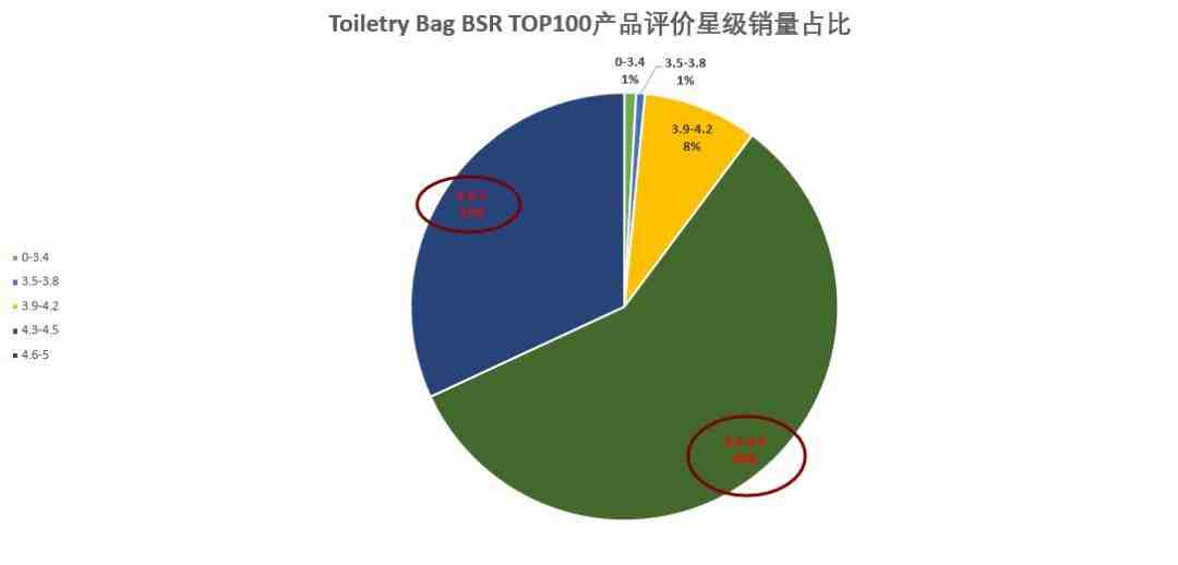 评价数量和星级高低和也是影响销量重要的因素,Toiletry Bag在BSR TOP100中,各星级单品出现次数如上图所示,其中低于3.8星仅3个单品,4星以上含90个单品,销量占比约90%。BSR TOP100平均评论数约280条,评论数量各个层次分布比较均匀,无特别高和特别低的极端现象。