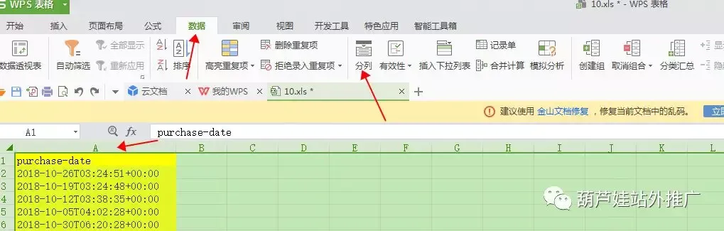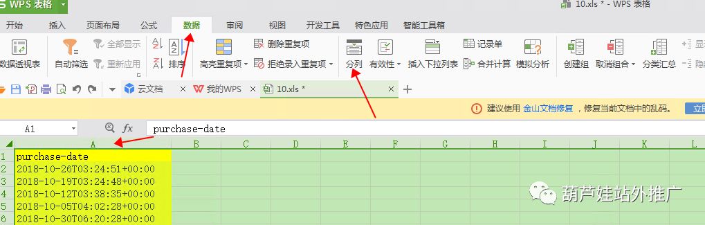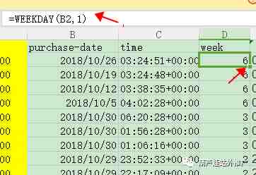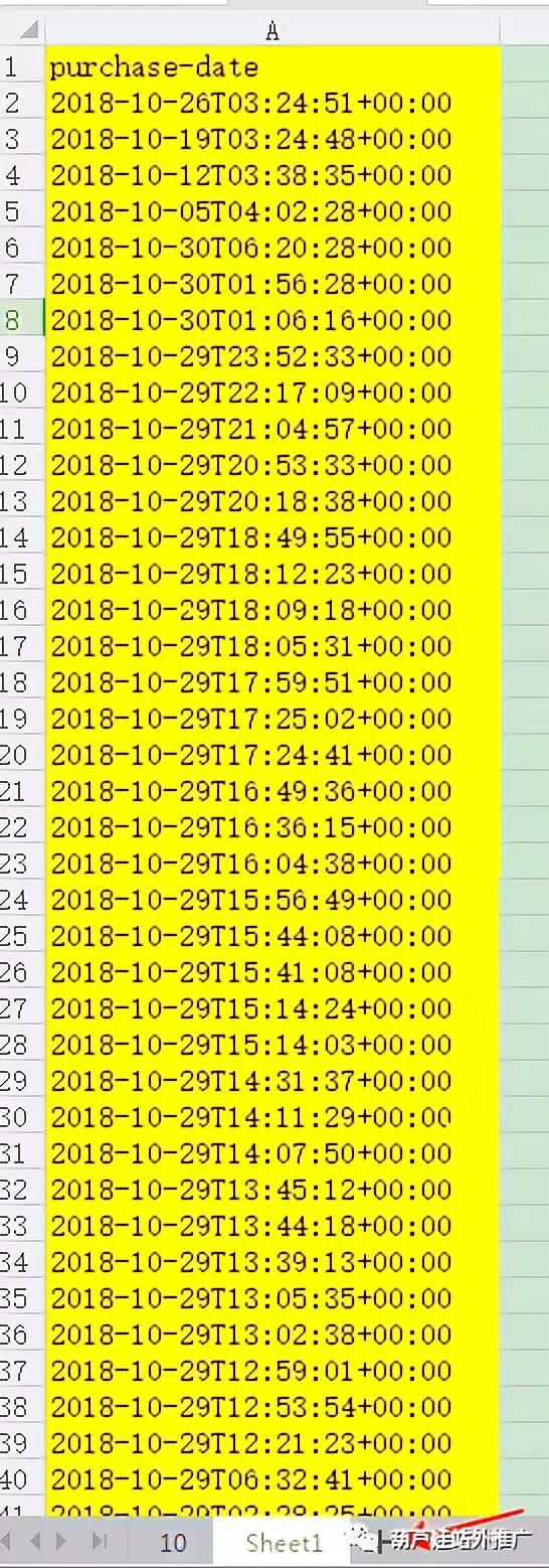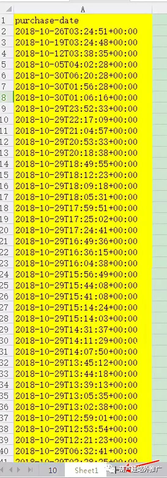 3: 我们主要目的是 “purchase-date”这项,里面包含了日期和具体的时间,我们要将它们提取出来,来分析我们的最佳LD投放时间,建议将该项复制出来到另一个sheet中,方便我们更好的提取。