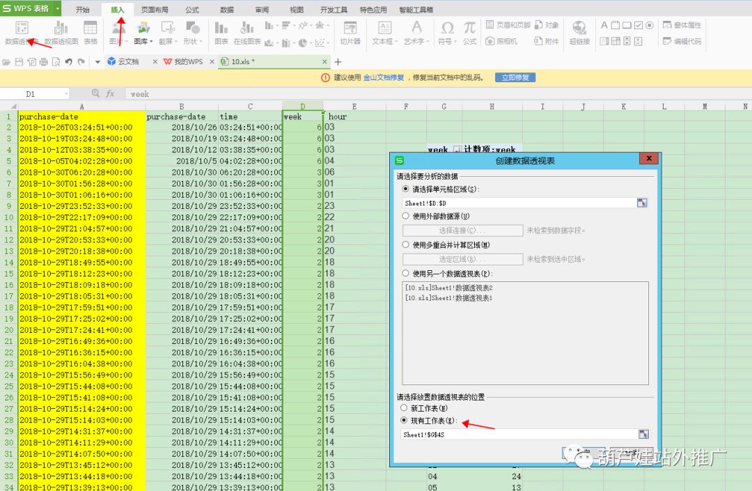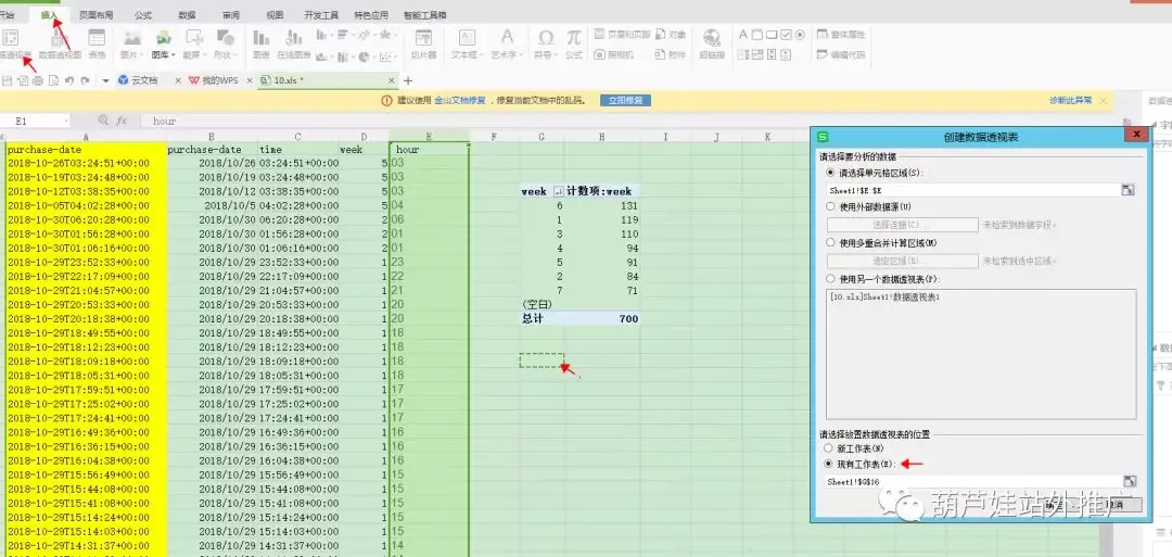 8:选取 week 列, 选择**->数据透视表,选取要透视的数据列,选择 位置为 现有工作表;