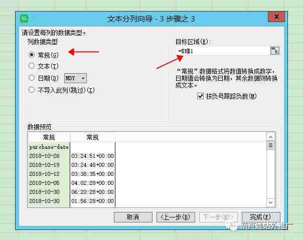 6:该步骤 设置数据类型 选“文本”,目标区域 将 其中的 “A” 修改为“B”,意思是将分列出来的数据 从B列开始导入,这样不会覆盖原有的A列的数据;然后点完成。