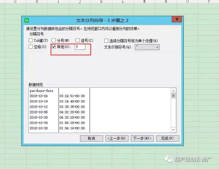 5:在分列导向的时候,将 其他 选项中填入“T”,将日期和时间分开,然后点击下一步