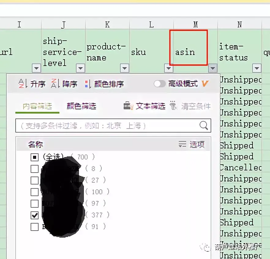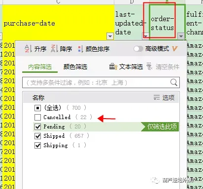 2: 将下载的多个表格汇总在一个表格里,选择“order status”,排除“cancelled”订单;选取我们的目标asin;
