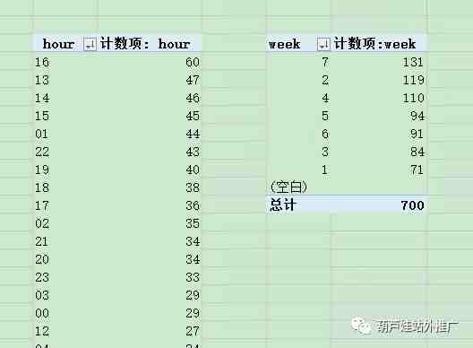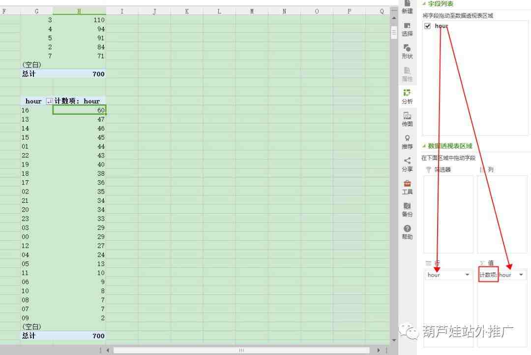12:将 hour 分别拉入 行 标签和值 标签, 值选项 选择 计数项,而不是求和项