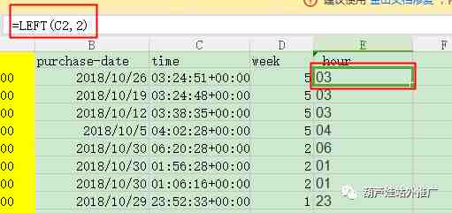 10: 筛选出最佳 LD时间,在hour(自己命名)下方输入函数 =LEFT(C2,2), 筛选出需要的时间,然后双击,全部填充;