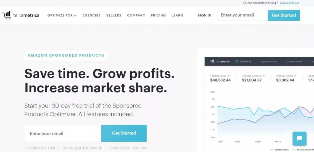 Teikametrics能帮助卖家节省时间,减少浪费的广告支出,并增加有机销售。通过它的数据学习、强大的自动化和专家指导,卖家可以找到有利可图的关键词,创建有针对性的广告系列以实现目标,并让该软件管理出价。