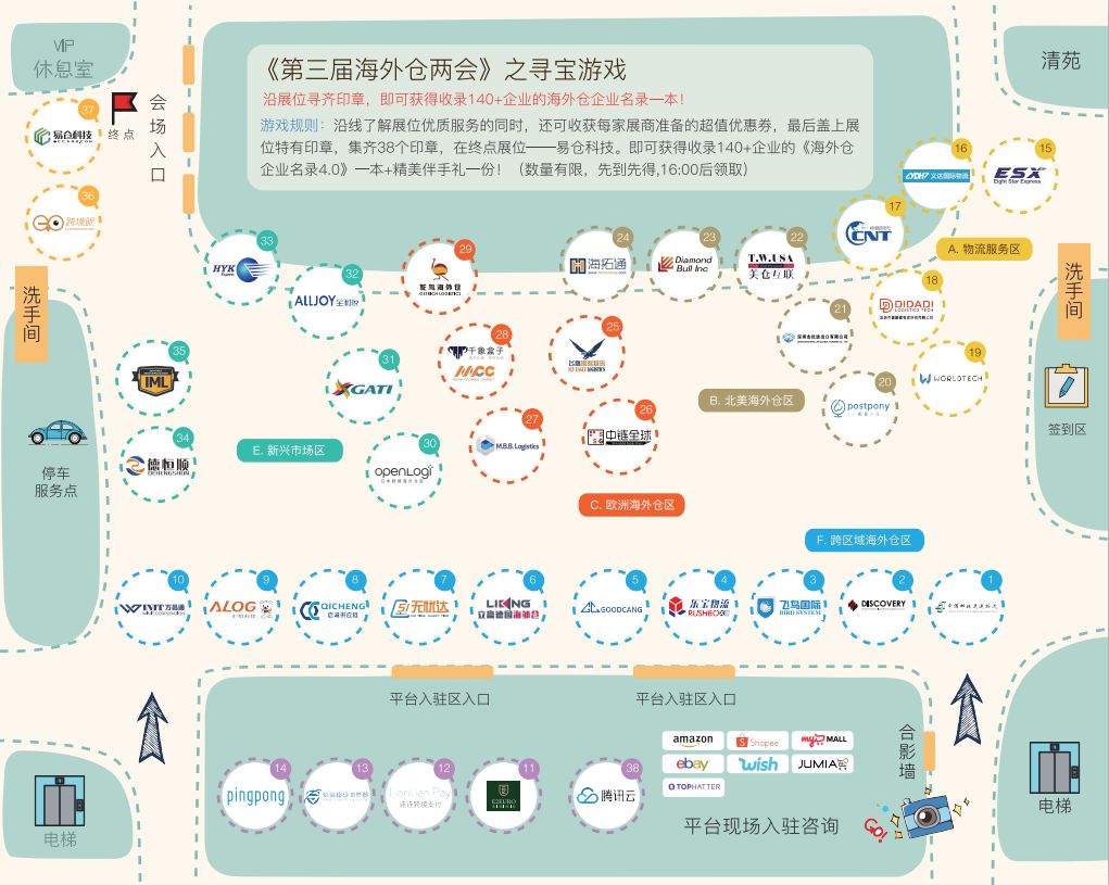 敲重点:这次的展位分区,分为欧洲仓区、北美仓区、新兴市场仓区、跨区域仓区、物流服务区,区区分明,非常方便参会小伙伴们定位自己的需求位置,少走弯路,多拿优惠!我掐指一算,一共有30多家展位呢~