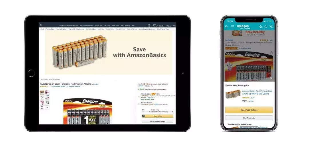 最近,亚马逊一直在测试更具侵略性的策略,为品牌带来买家。在下面的示例中,无论是在电脑桌面,还是在移动设备App上,Energizer电池页面都有直接要求购买AmazonBasics电池的话语。该公司正在为其产品组合中的AmazonBasics产品和其他品牌测试这种方法的效果。