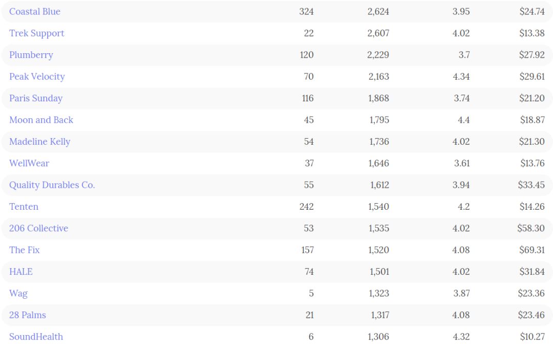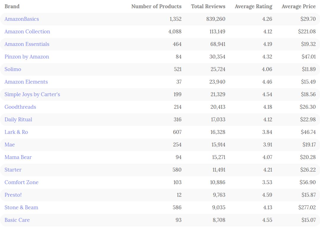 亚马逊拥有的自有品牌按其累积的客户评论总数排序如下图所示: