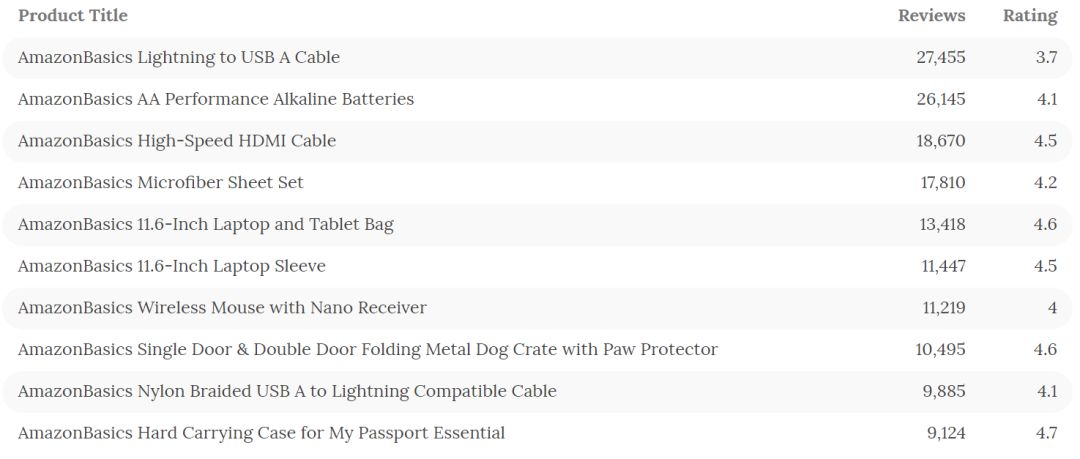 AmazonBasics在品类和价格竞争压力下,创造了开放品类并取得了成功。当查看AmazonBasics Top 10热销产品时,不拘一格的产品组合非常明显: