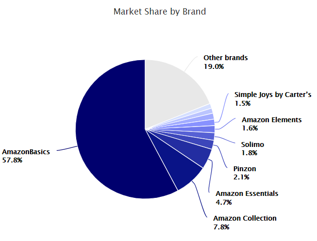 Top 10自有品牌的评论共占所有自有品牌产品客户评论的81%,因此假设所有亚马逊自有品牌的销售额占总销售额的81%。但仅AmazonBasics就占总销售额的57%。Top 3品牌:AmazonBasics、Amazon Collection和Amazon Essentials,加起来占总销售额的70%。与Amazon Elements一起,名称里带有“Amazon”的自有品牌销售额占据总销售额的72%以上。
