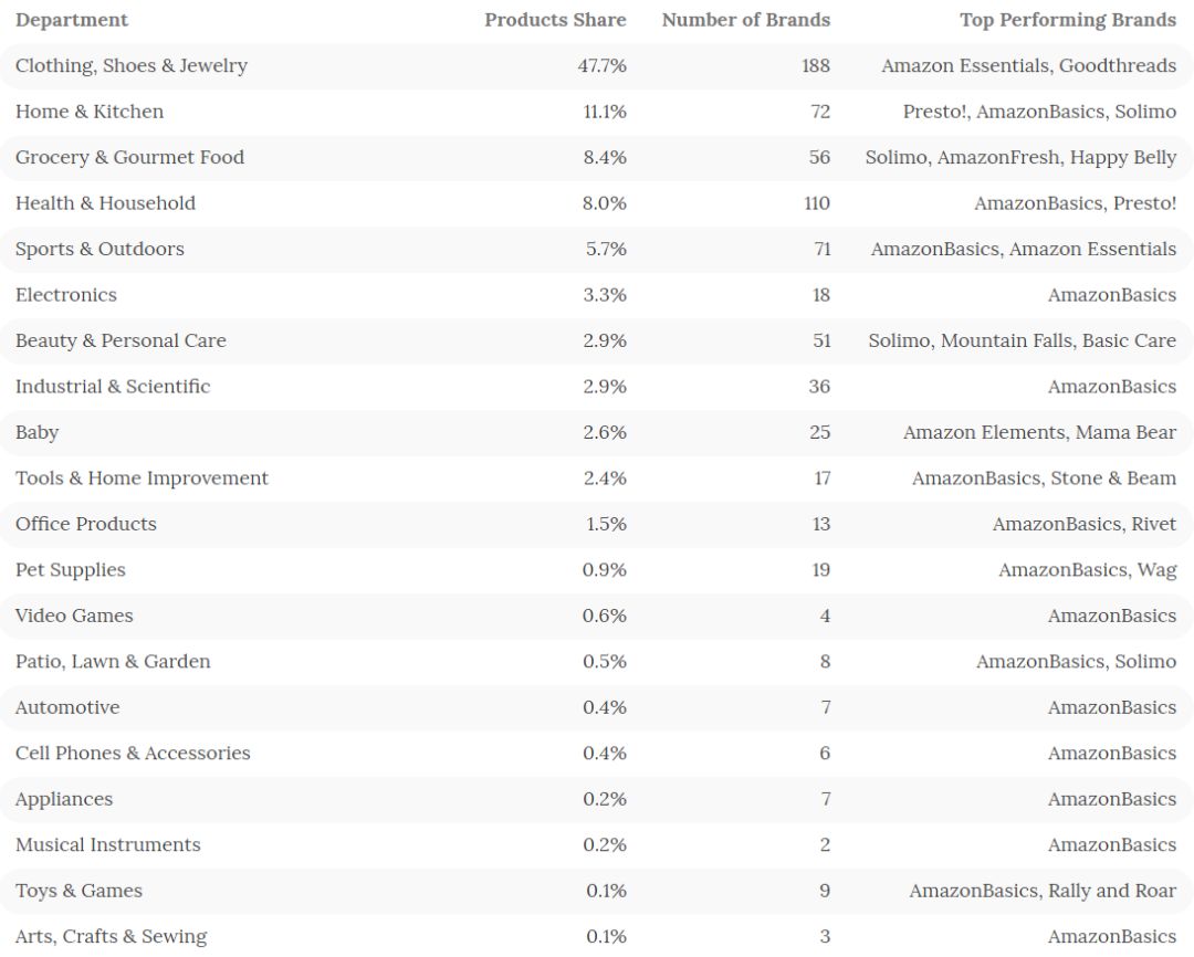 该电商情报公司分析了亚马逊超过400种自营品牌的23000多种产品,其中包括了亚马逊自有品牌产品和第三方制造商通过亚马逊独家销售的产品。