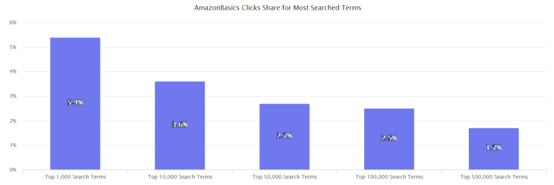 亚马逊上前1000个搜索关键词中有5.4%导致客户点击AmazonBasics产品,这一比例在前10000个搜索关键词中是3.6%,前100000个搜索关键词是2.5%,前500000个搜索关键词中是1.7%,即有8392个不同搜索关键词,导致客户点击AmazonBasics产品。