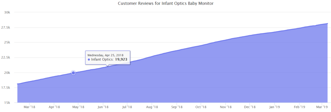 “baby monitor(婴儿监视器)”是搜索次排名第142高的关键词,它为Infant Optics品牌创造了空间。 Infant Optics婴儿视频监视器自推出以来一直是Baby Monitors品类中最畅销的产品,它已经有超过28000条评论,评级达4.4星。在过去的12个月里,该产品的评论增加了10000条。该婴儿监视器售价为165.99美元。与Orolay冬季夹克相似,Infant Optics婴儿监视器也跨平台吸引了众多关注。