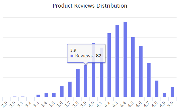 亚马逊自有品牌产品平均评级为4.1星,最高5星。Top 10自有品牌中有30%的产品评级为4.5星或更高,83%评级为4星或更高。产品评论呈正态分布曲线。但是,它不是对称的,相反形状向左倾斜。
