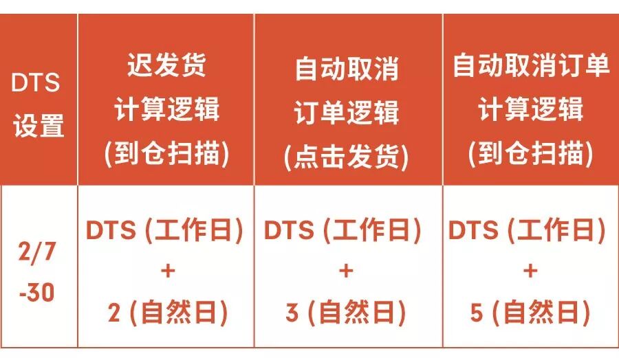 小虾台湾市场店铺DTS为2,买家2月18日下单,19、20为备货时间,再加上两个自然日21、22,如果22号还没有到仓,则算迟发货。买家2月21日下单,22、25为备货时间(23、24为周末,非工作日),再加两个自然日26、27,如果27号还没有到仓,则算迟发货。