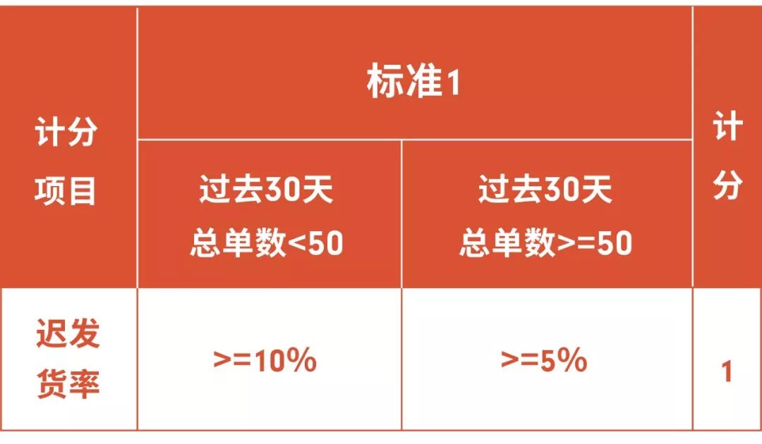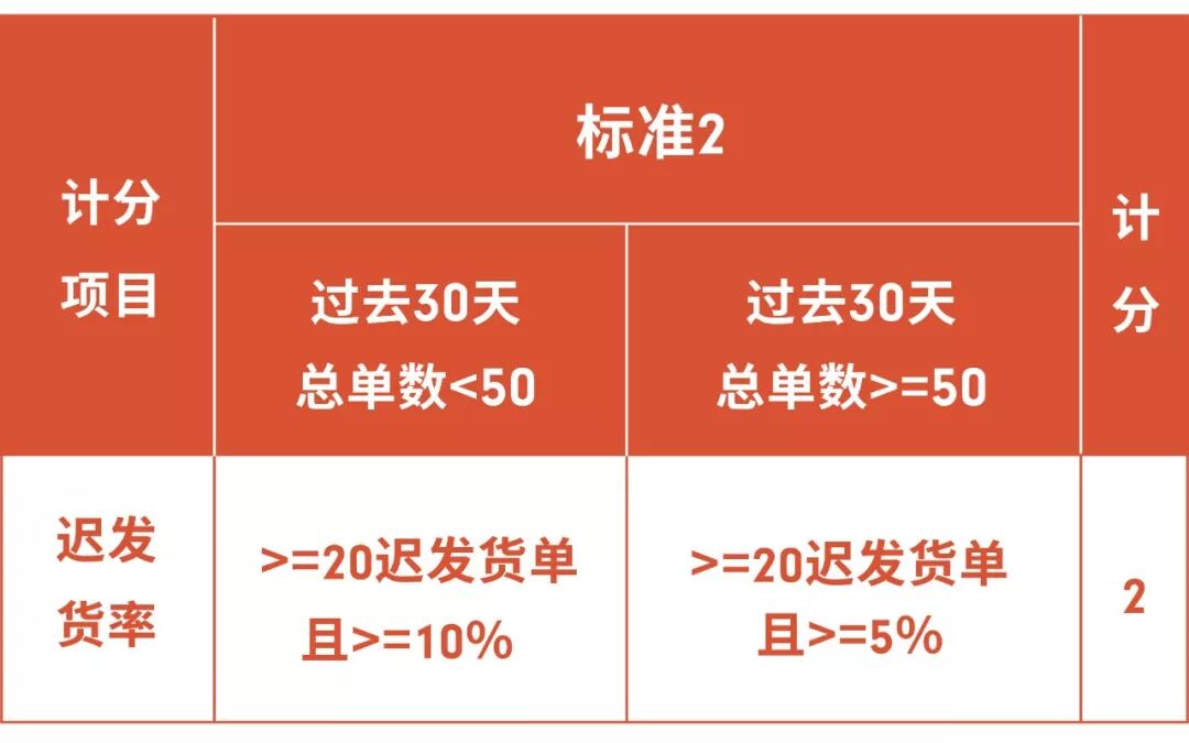 小虾台湾站店铺2月1日-3月2日(共30天)有100单,3月1日小虾打算将其中的50单一次性发货,但因为卖家自身原因延迟了发货,那么迟发货率0.5(50/100),迟发货单数50(符合条件:迟发货单数>=20),将会被扣2分。小虾3月1日这批订单的迟发货影响将持续30天,一直到3月31日才消除影响。