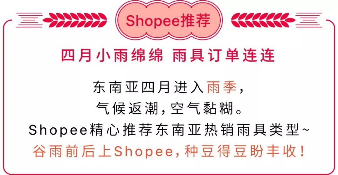 聆听谷雨时节雨水叮咚的乐章,大麦正蹭蹭地拔节。卖家朋友们,时至暮春,初夏将至,丰收的金秋还会远吗?卖家们可上新雨具,东南亚的雨季就是卖家们的丰收季。