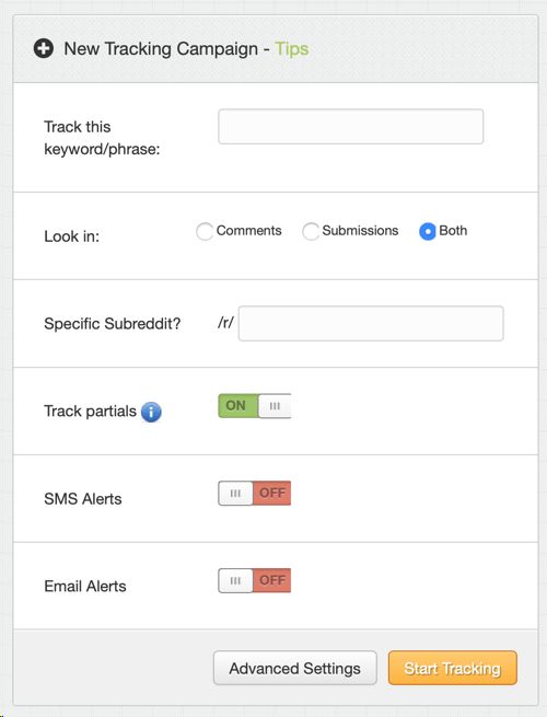 如果有人在Reddit上使用你设置的关键词或短语,TrackReddit(具有免费和高级功能)就会向你发送提醒。这样,你就可以在用户提及你的品牌时快速进入,并加入到确切主题或产品类型的对话中。设置方式如下图所示: