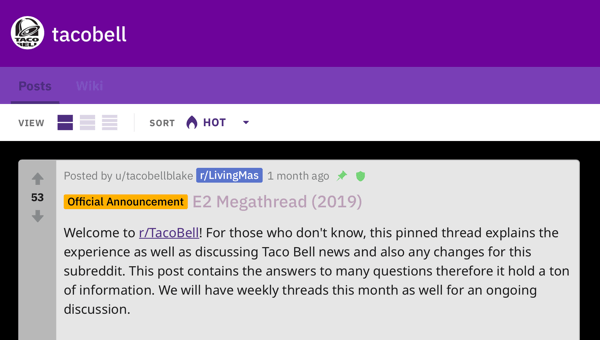 这样一来,肯德基就可以凭借这条广告帖直接跳到首页,获取曝光率。但也对Reddit社区做出了贡献。肯德基的姊妹品牌TacoBell有自己的看板,里面都是一些含金量较高的内容。