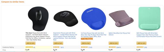 注意这个不一定每一个类目都有。很多类目当你产品上上去个把星期,你的产品下面会有5个位置把你和竞争对手的产品,各种颜色款式价格放到一个对比界面,也有可能自己跟自己对比,亚马逊根据产品相似性和客户购买习惯来抓取推荐。
