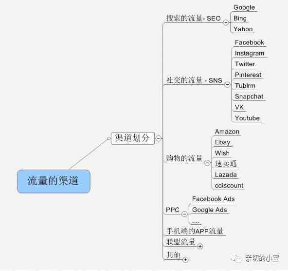 一级流量:搜索流量,社交流量,购物流量,PPC流量,这部分流量占了跨境电商95%的流量份额。