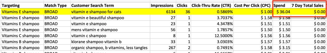 广告费用可能根据预算和产品利润率的不同而不同,但可以肯定的是,任何花费超过35美元的广告,还无法转化的搜索关键词,都应设置为否定关键词。