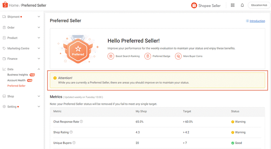 卖家需通过优选卖家页面密切监控店铺表现,以免失去优选卖家的资格。如果收到预警通知(黄色Attention!图标),需及时改善表现。