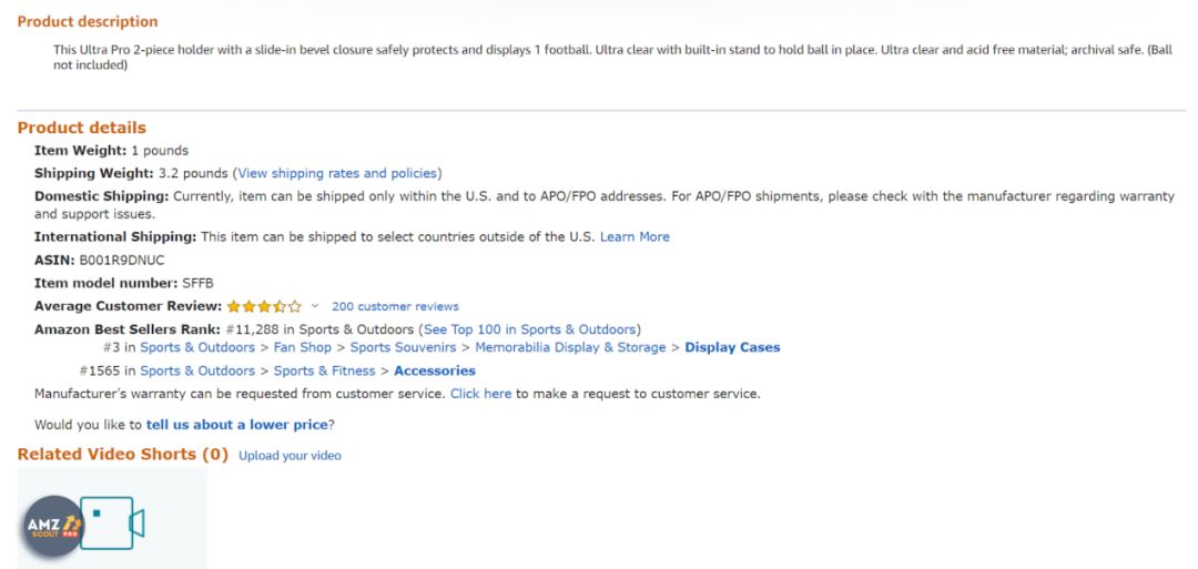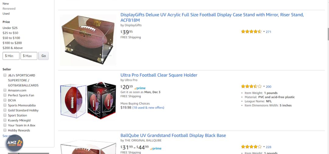 请注意,在搜索结果的第一页,出现了名为Ultra Pro Football Clear Square Holder的产品,但客户评级仅为3.5星级。这意味着即使顾客对该产品不完全满意,但也卖得不错。从中可以得出,假如你是销售类似产品的卖家,如果你能够改善现有产品的一些缺陷,那么你的产品将会获得成功。