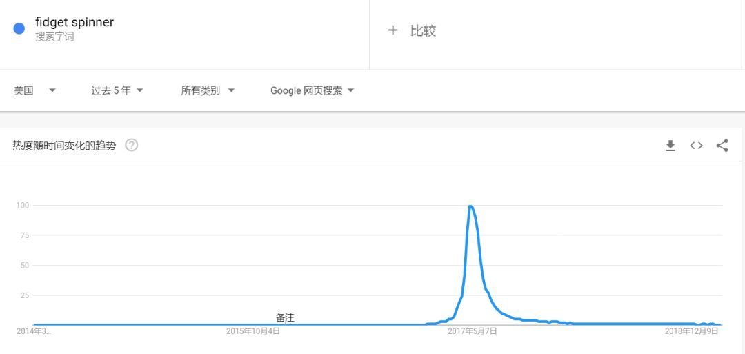 你注意到了吗?从2017年初开始,该产品的搜索量(即消费者对该产品的兴趣)出现了惊人的增长。谷歌不会明确显示一个词的搜索次数,所以所有的搜索结果都是相对的。可以看到,2017年年中指尖陀螺的搜索次数是2015年的100倍。