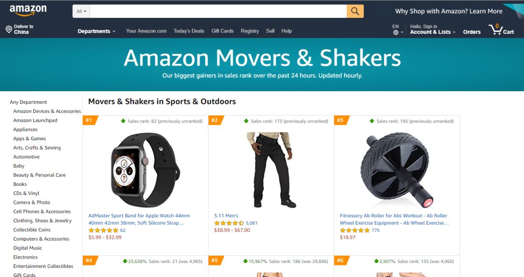 你也可以换个角度,打开亚马逊的“Movers & Shakers(飙升榜)”的畅销产品目录。在页面上你会可以看到过去24小时畅销产品目录,有可能看到之前普普通通的产品,需求突然激增。