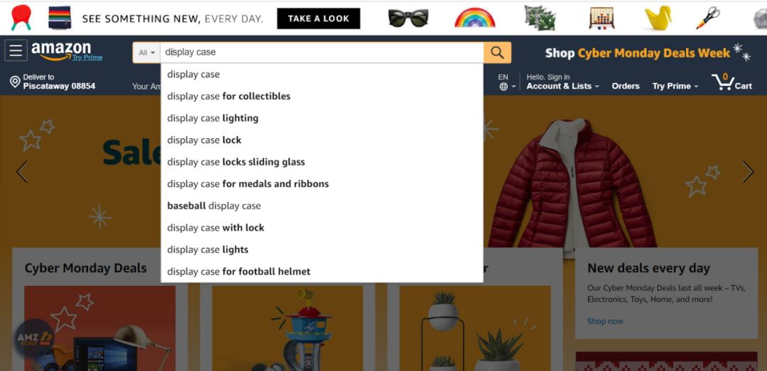 以Frank为例,假设他已经成功地推出了橄榄球展示盒,现在要推出另一个相似的产品。Frank可以做的是:在亚马逊的搜索栏中输入“display case”,然后看看会出现什么。以下是他发现的: