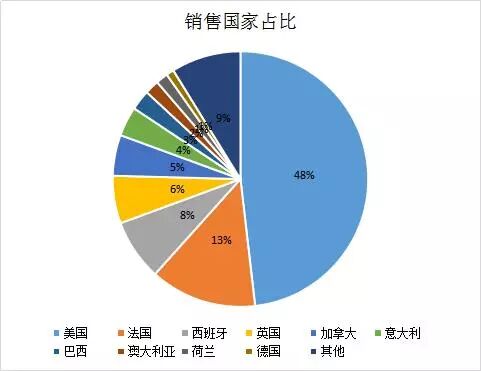 - 销售占比TOP5国家分别为美国,法国,西班牙,英国,加拿大;